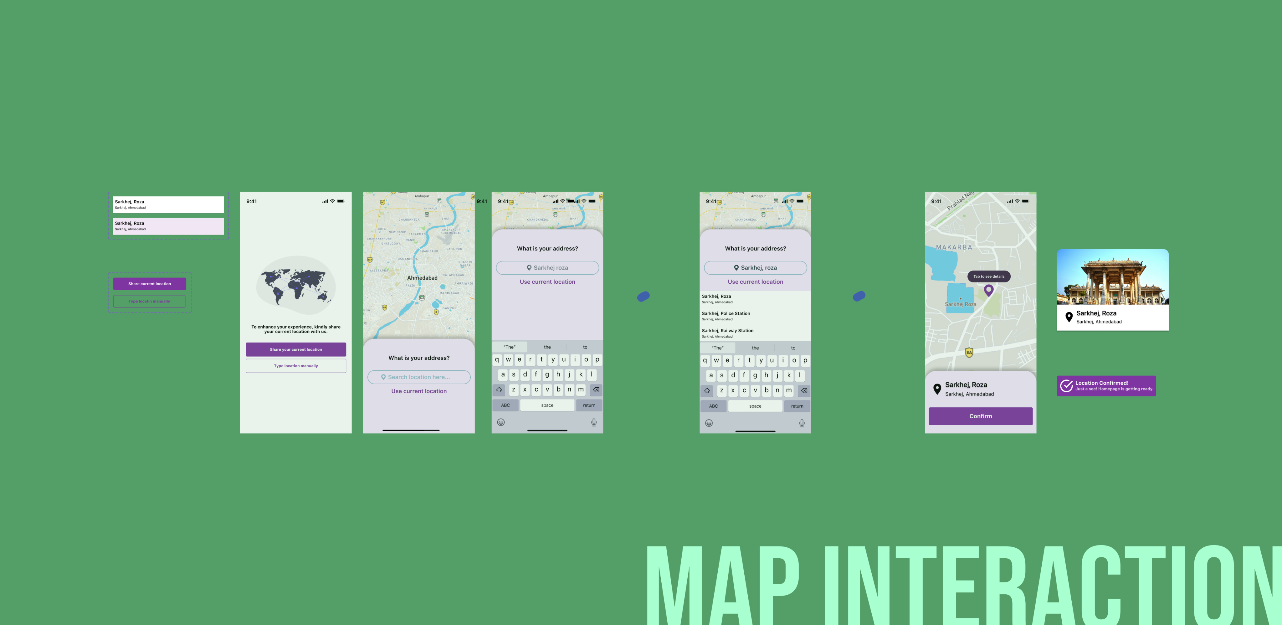 Interactive map-based interface design showcasing location services and destination selection manually with clean and modern UI elements.
